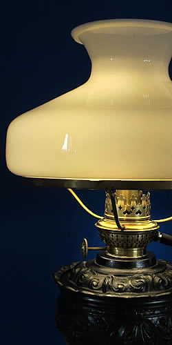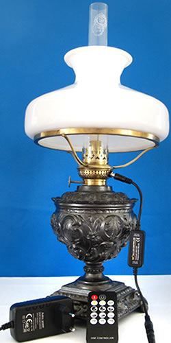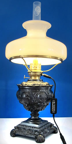 Eine prächtige, über 100 Jahre alte Petroleumlampe mit einem reich dekorierten Lampenkörper aus Zinkdruckguss und einem eleganten Glasschirm. Steuerung der Helligkeit mit Fernbedienung.