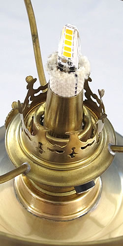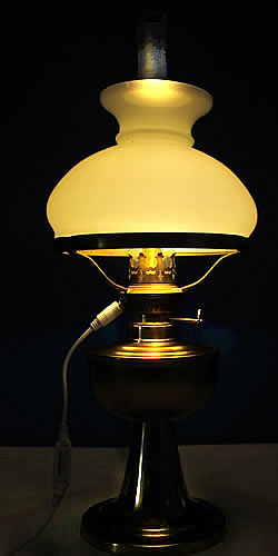Ein überzeugendes Beispiel einer "schummerig" leuchtenden Petroleumlampe im dunklen Zimmer. Die Dimmerstufe ist hier für das Foto auf 10% eingestellt.